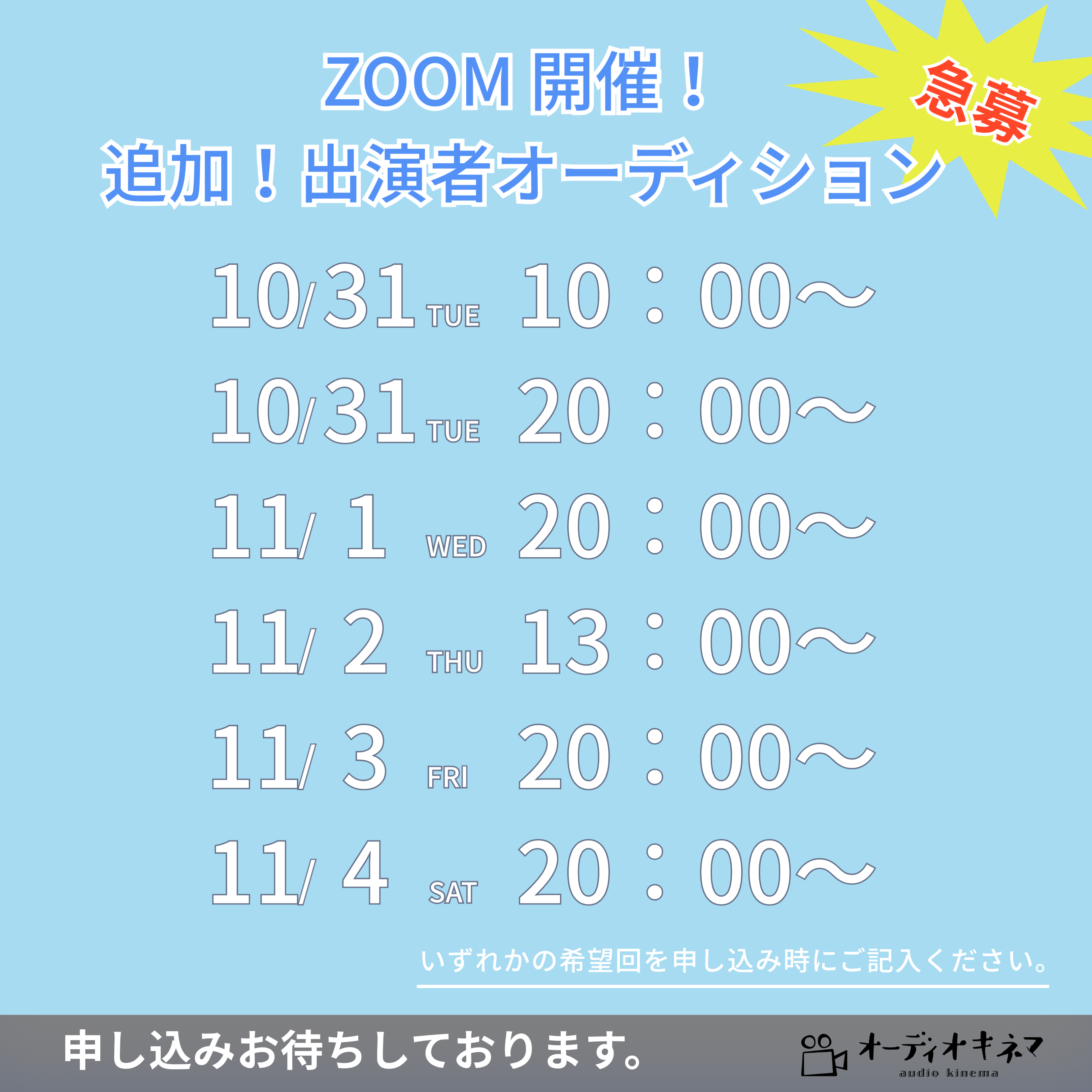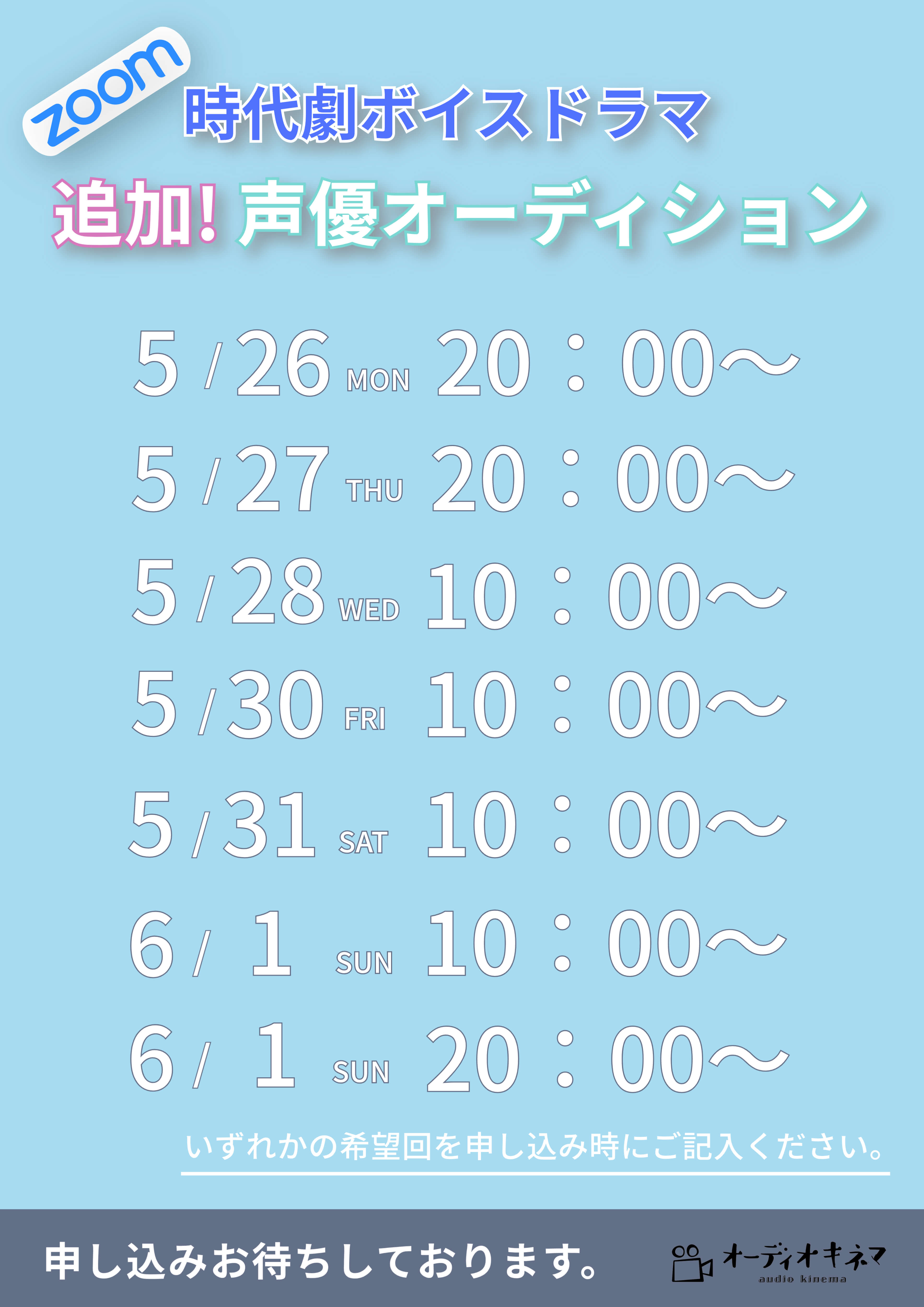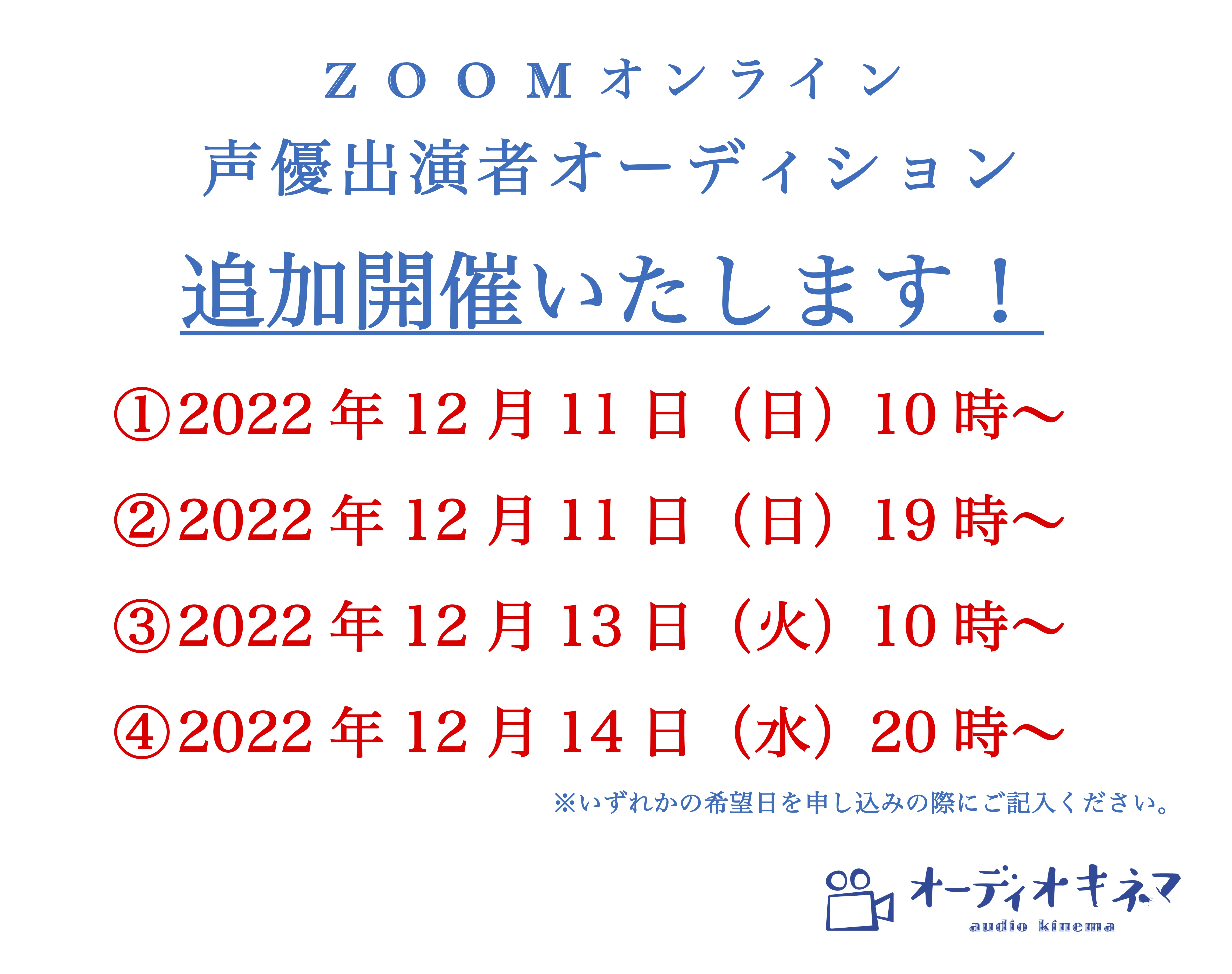 | 書類送付先 | 〒135-0047 東京都江東区富岡2-5-6 京徳第二ビル101 オーディオキネマ オーディション係 |