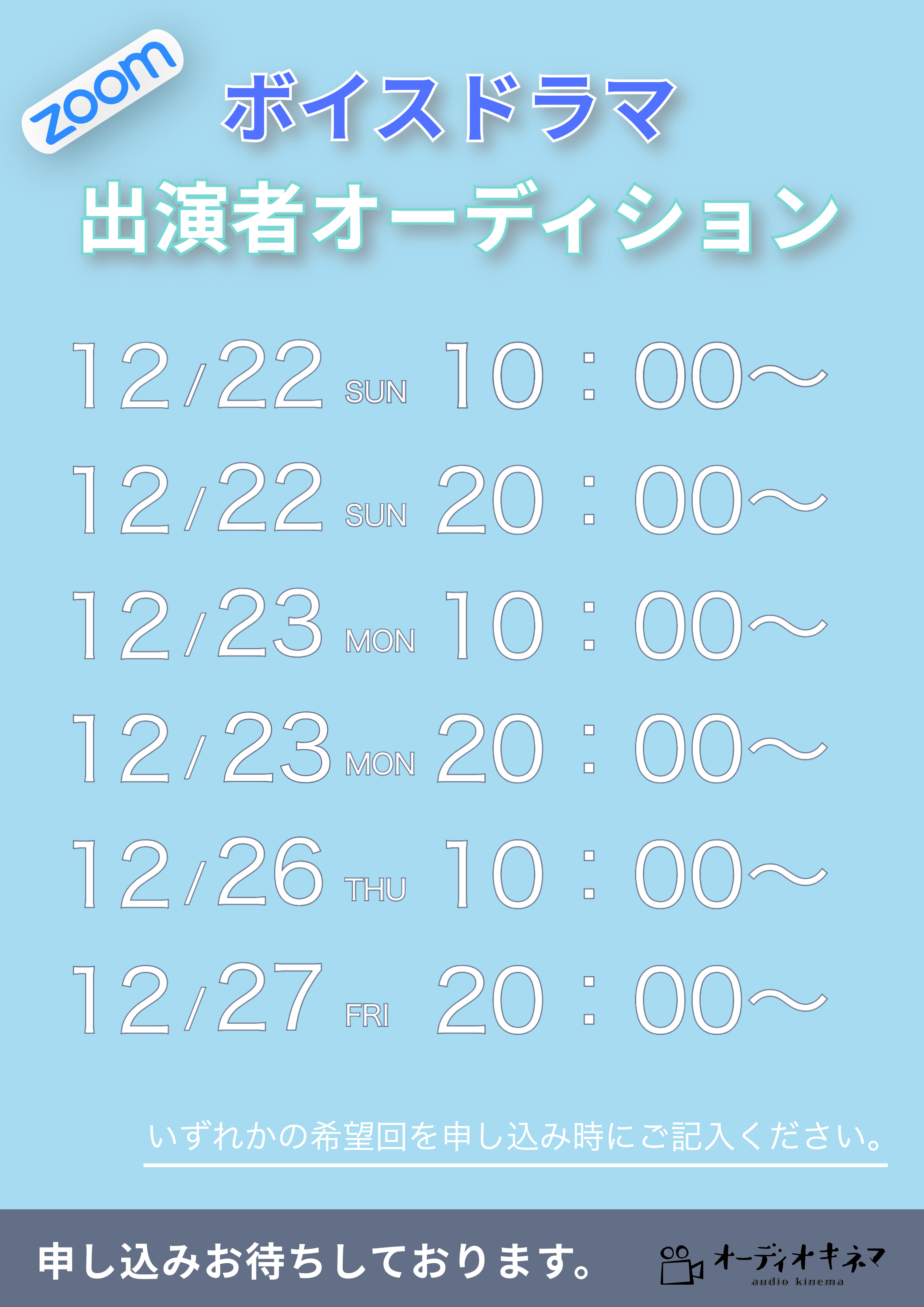 | エントリー方法 | E-mail : audiokinema@audiokinema.com へ申し込み下さい。 お名前と、希望の参加回をお知らせください。 自宅録音の環境がある方は、その旨ご記載お願いします。 |