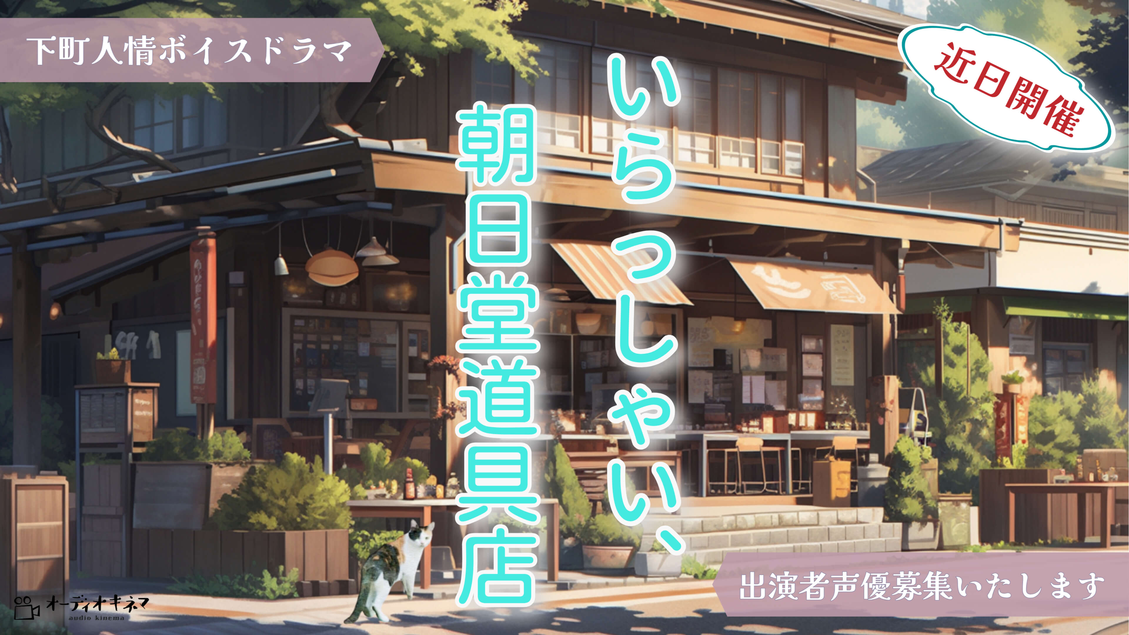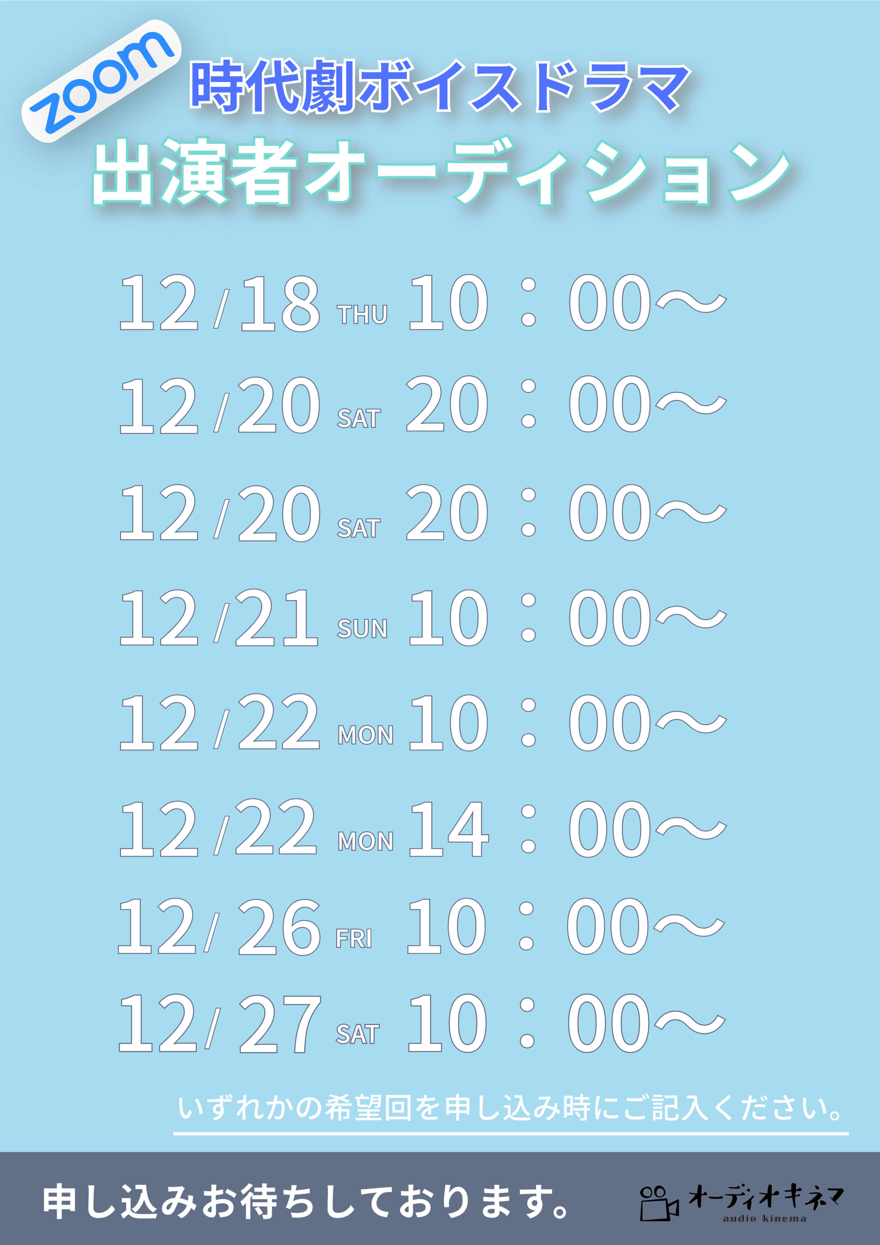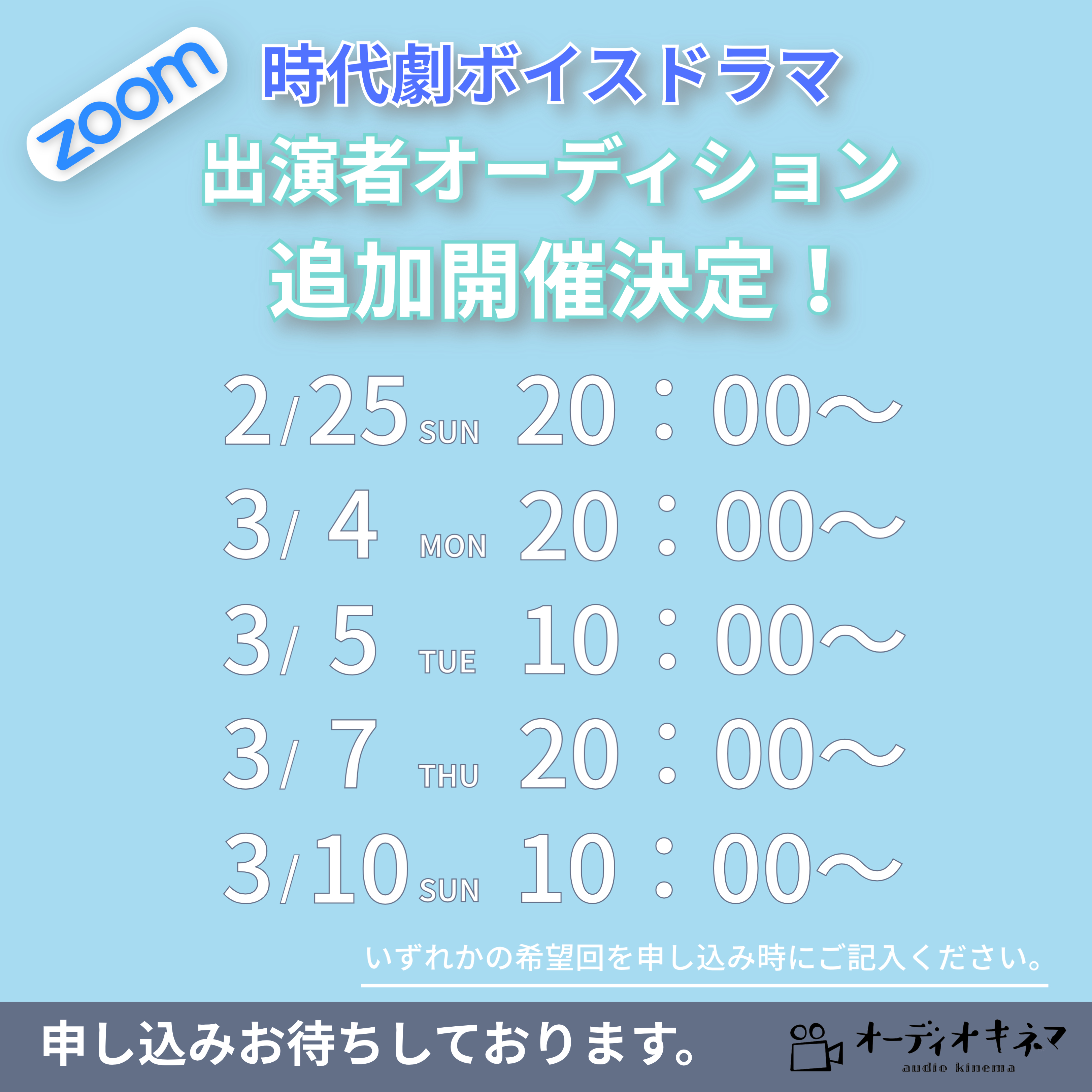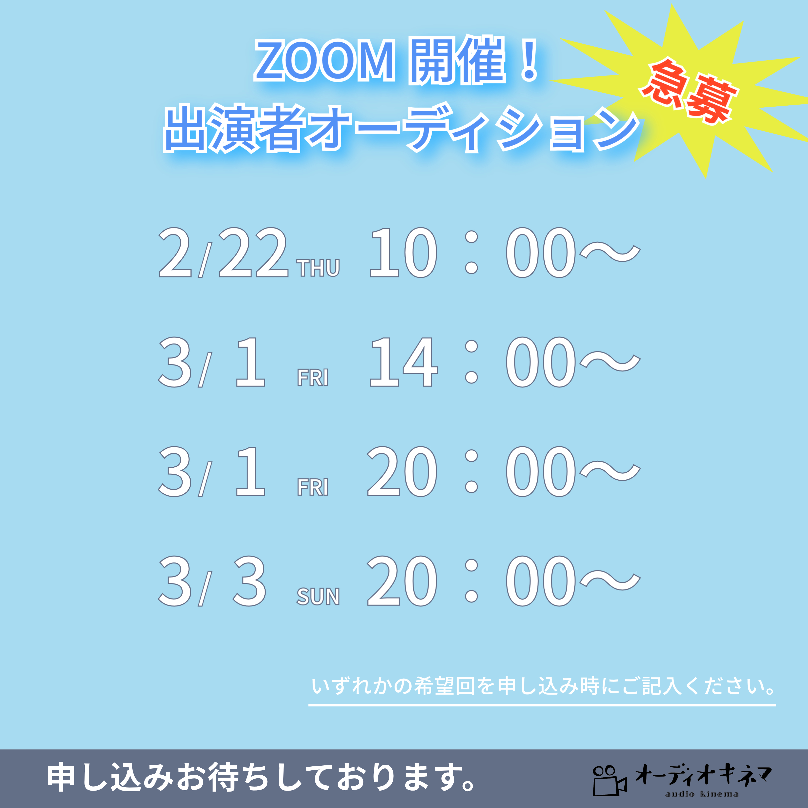 | エントリー方法 | E-mail : audiokinema@audiokinema.com へ申し込み下さい。 お名前と、希望の参加回をお知らせください。 自宅録音の環境がある方は、その旨ご記載お願いします。 |