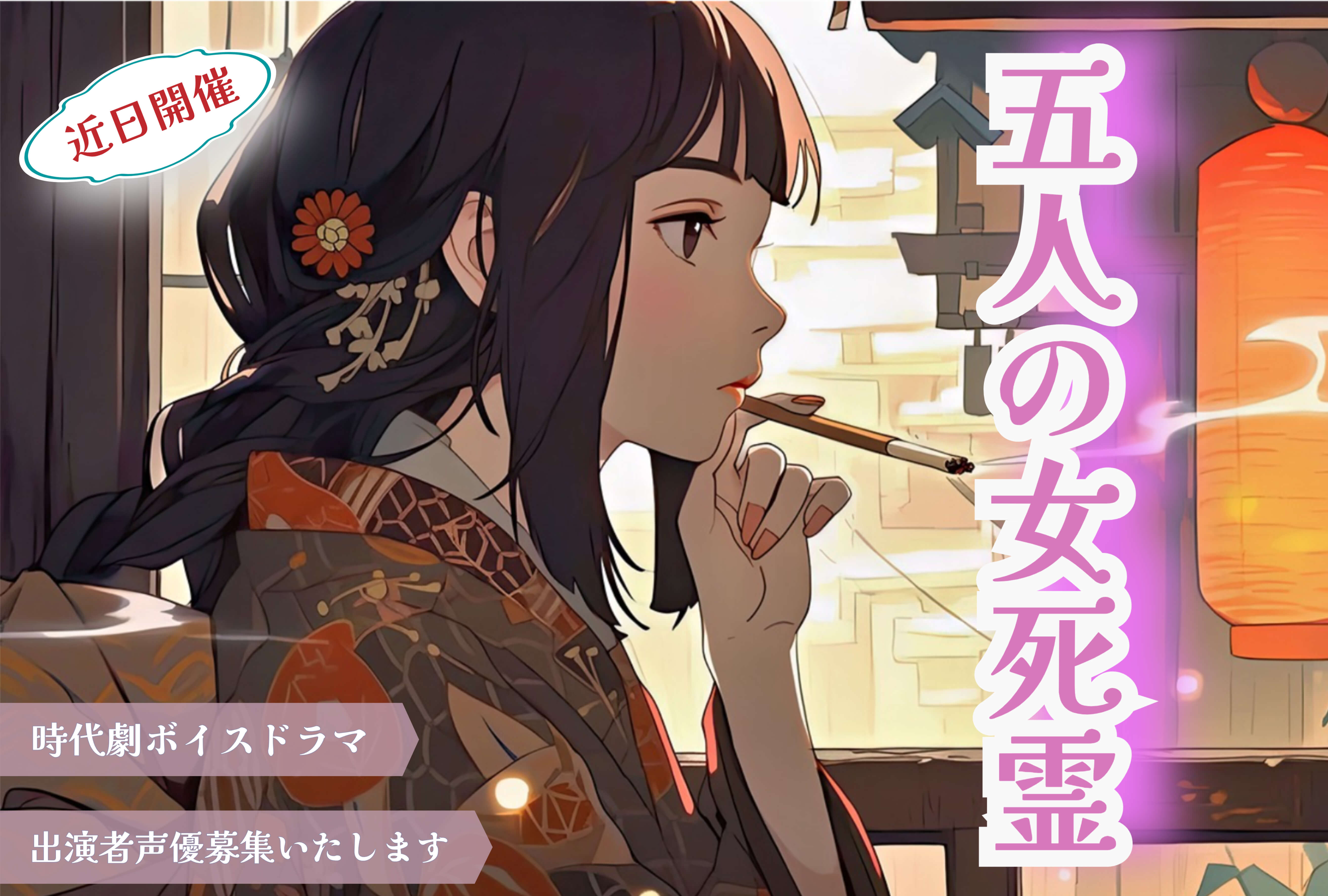 | 参加資格 | 年齢、経験は問いません。 オーディション対象の登場人物は、 富田林五郎兵衛(40歳)・・・京都から人探しに江戸へやってくる気さくな侍。 有修(20歳)・・・第2話の中心人物となる謎多き雲水。 お静(26歳)・・・書物を愛し、「南総里見八犬伝」を研究している才女。 お富(33歳)・・・辰吉、お銀夫婦と昔親しかった女郎。この女の死から物語は始まる。 華村五十鈴(21歳)・・・女剣士浅田留伊のライバルとして登場する女性。 山名伊織(42歳)・・・北町奉行の同心。辰吉はこの男の手先をつとめている。 旭屋甚五郎(45歳)・・・旭書林の亭主。男谷精一郎行きつけの書店。 ※この他、町人の男女多数、武家の男女多数の募集を行います。 第二話についての一般募集は、これが最後のチャンスとなります。 皆様のご応募お待ちしております。 |
